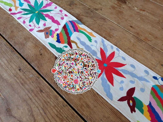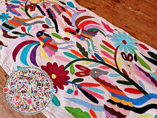 Camino de mesa Otomí flora y fauna multicolor bordado a mano "En existencia diseños similares"