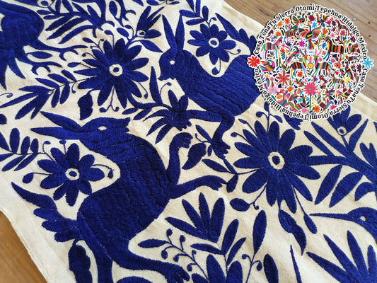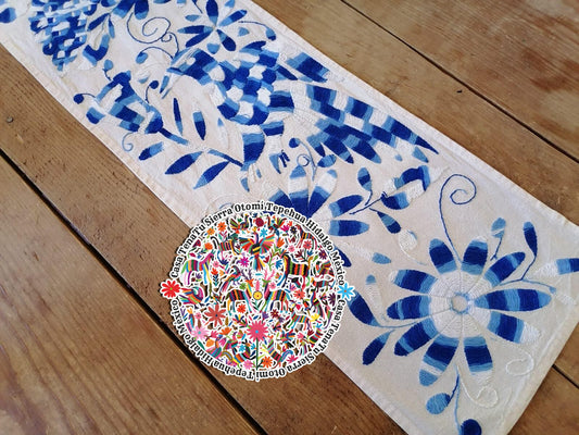 Camino de mesa Otomí 180 x 23 cm hilos azules bordado a mano "BAJO PEDIDO"