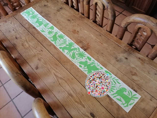 Camino de mesa Otomí con hilos color verde 190 cm x 20"bajo pedido"