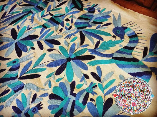 Lienzo original Tenatu flora y fauna en azules, Otomi bordado a mano (sobre pedido)