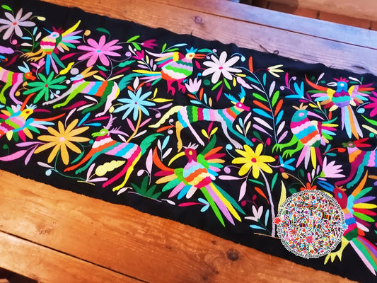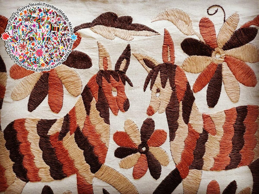 Lienzo bordado multicolor Otomí Cosmovisión "arrieros somos"