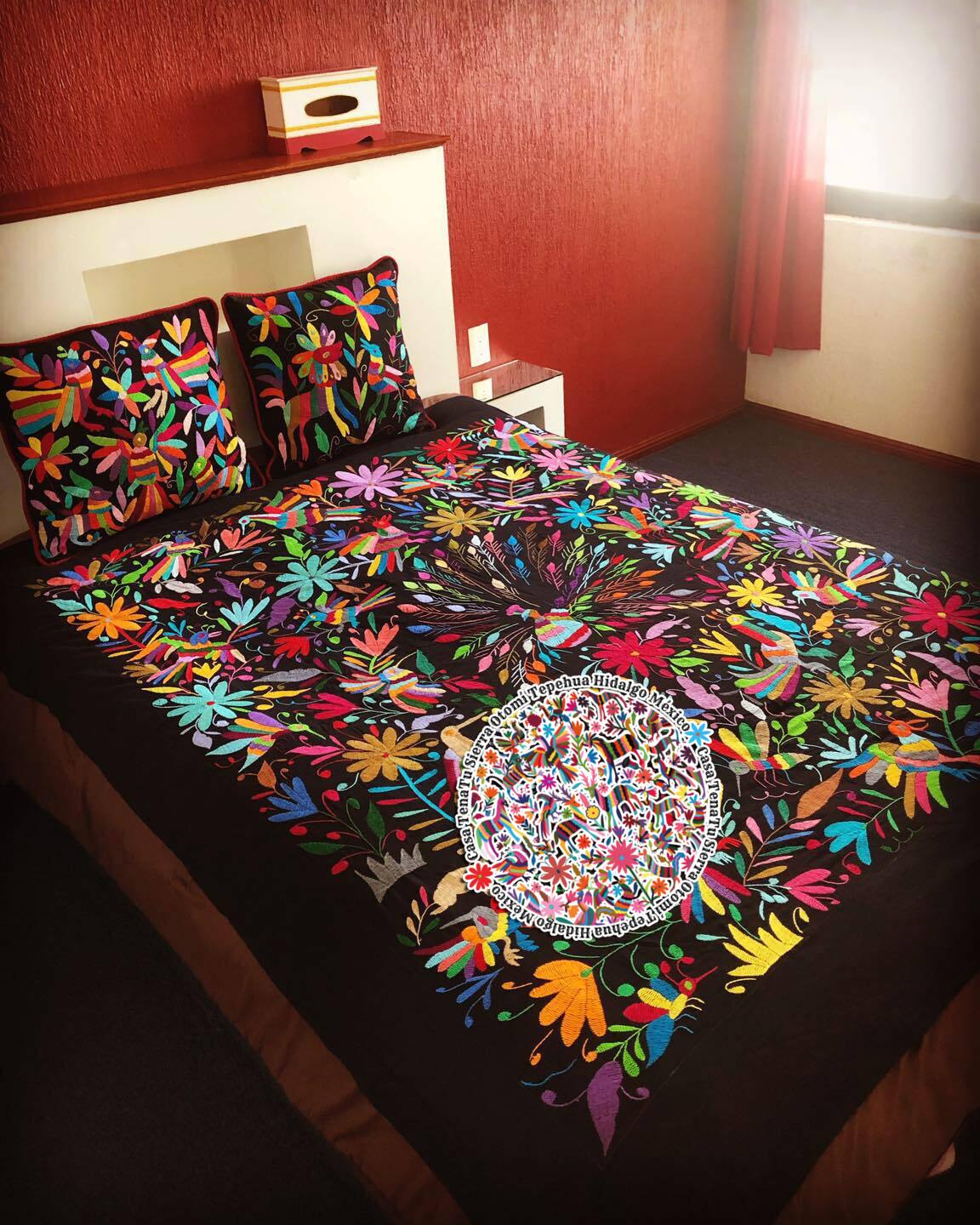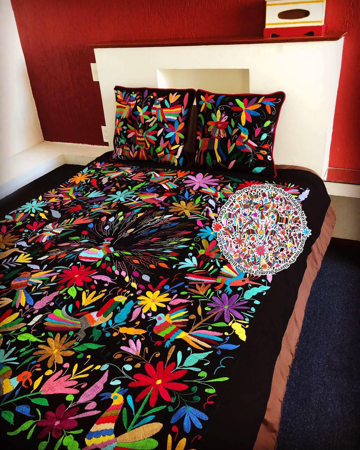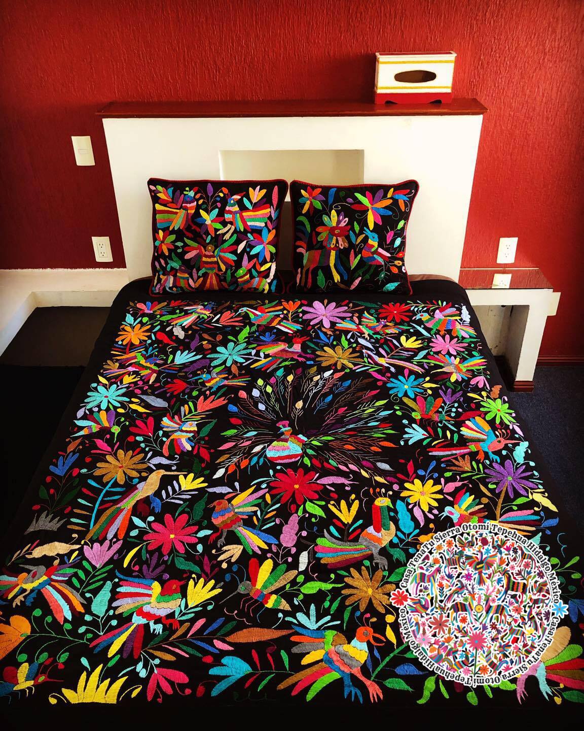 Cubrecama clásico pavorreal negro Otomí Matrimonial & Queen (bajo pedido)