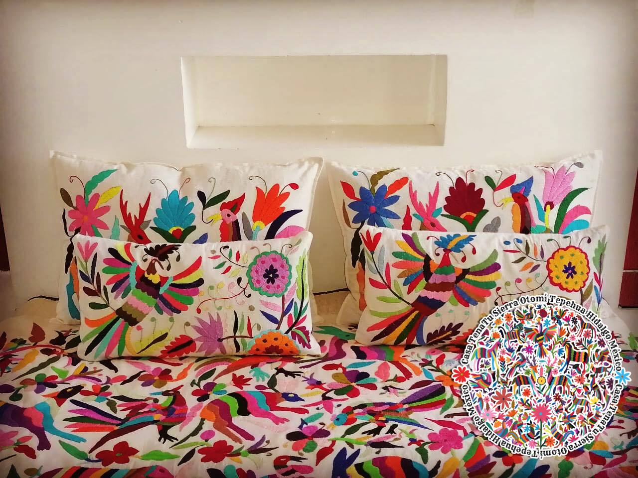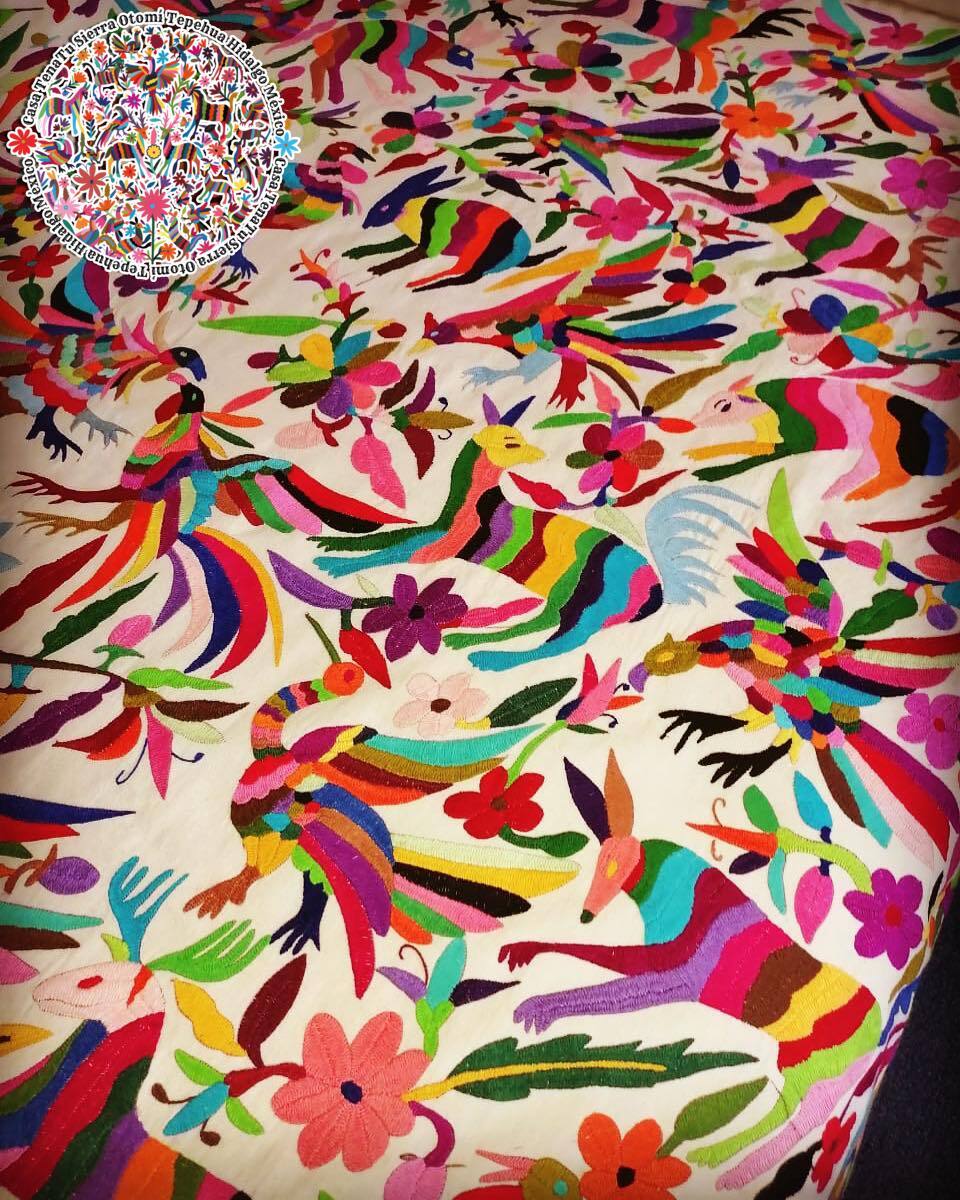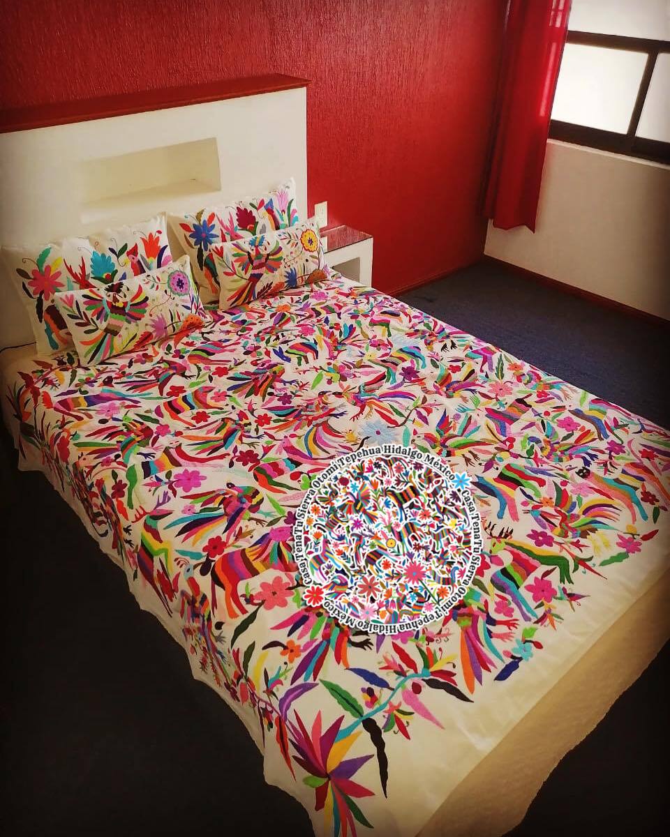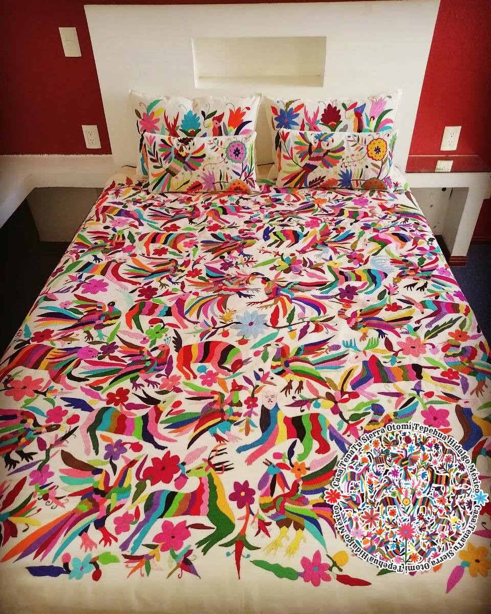 Cubrecama Otomí, representando la flora y fauna de San Bartolo Tutotepec Sierra Otomí de Hidalgo.
