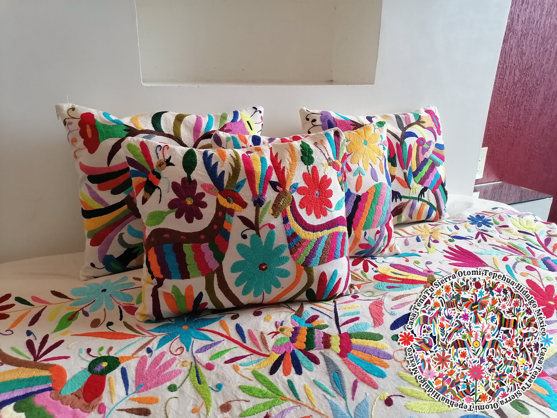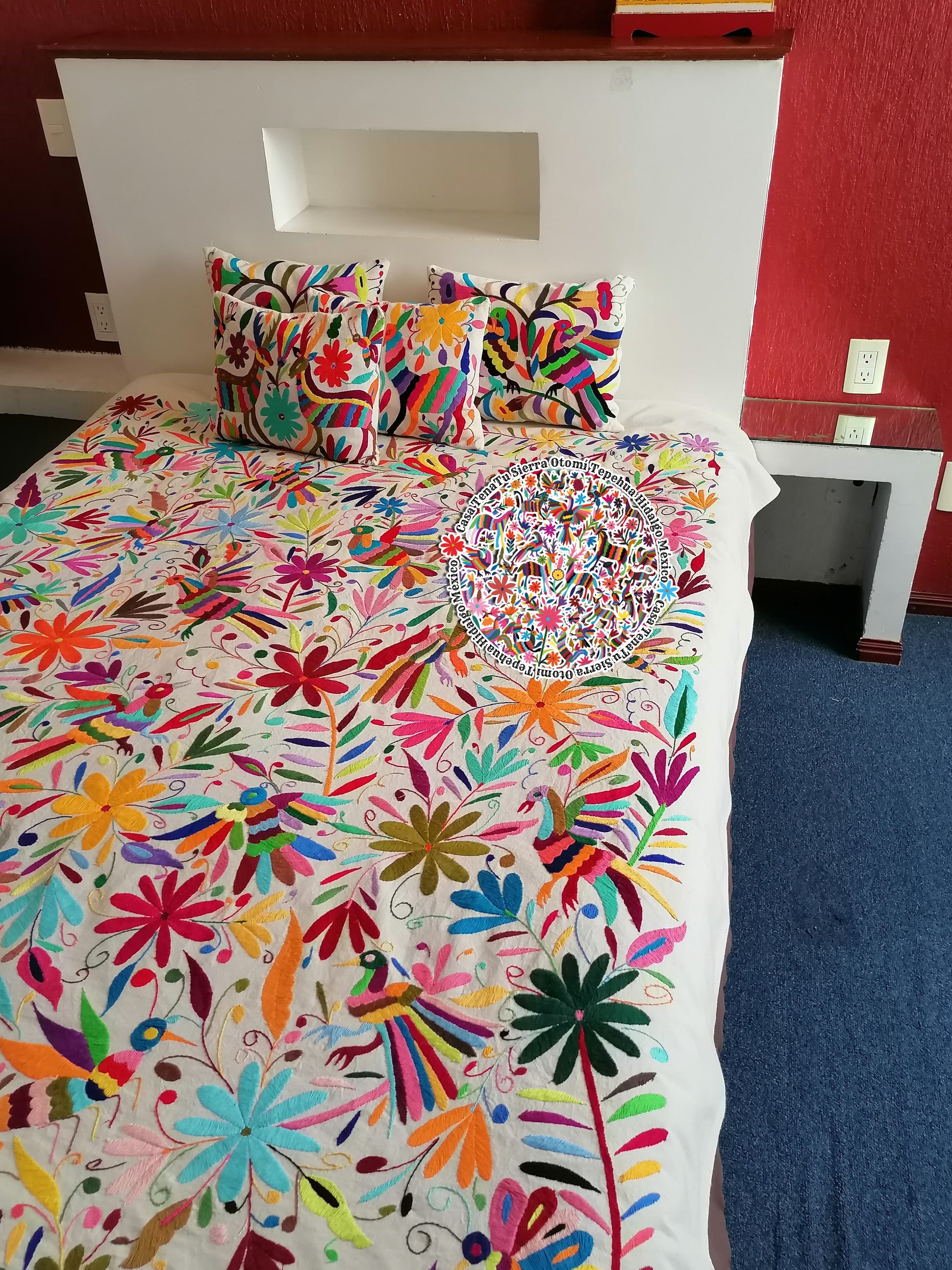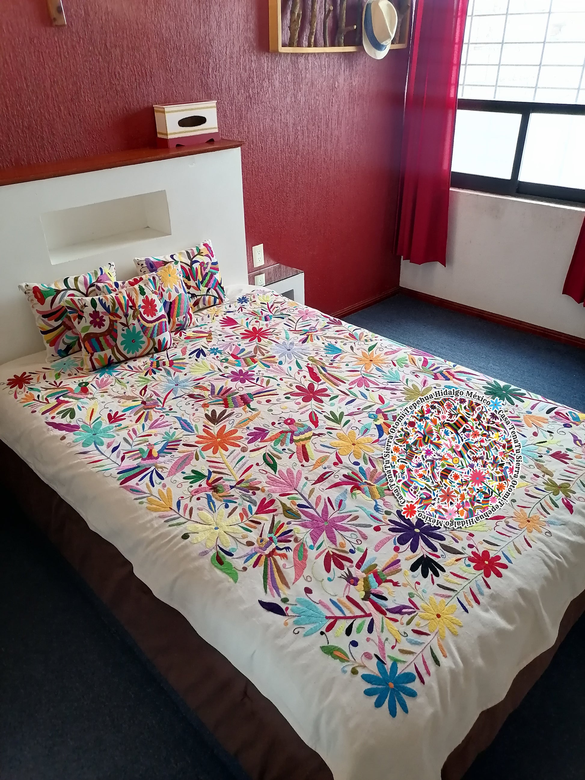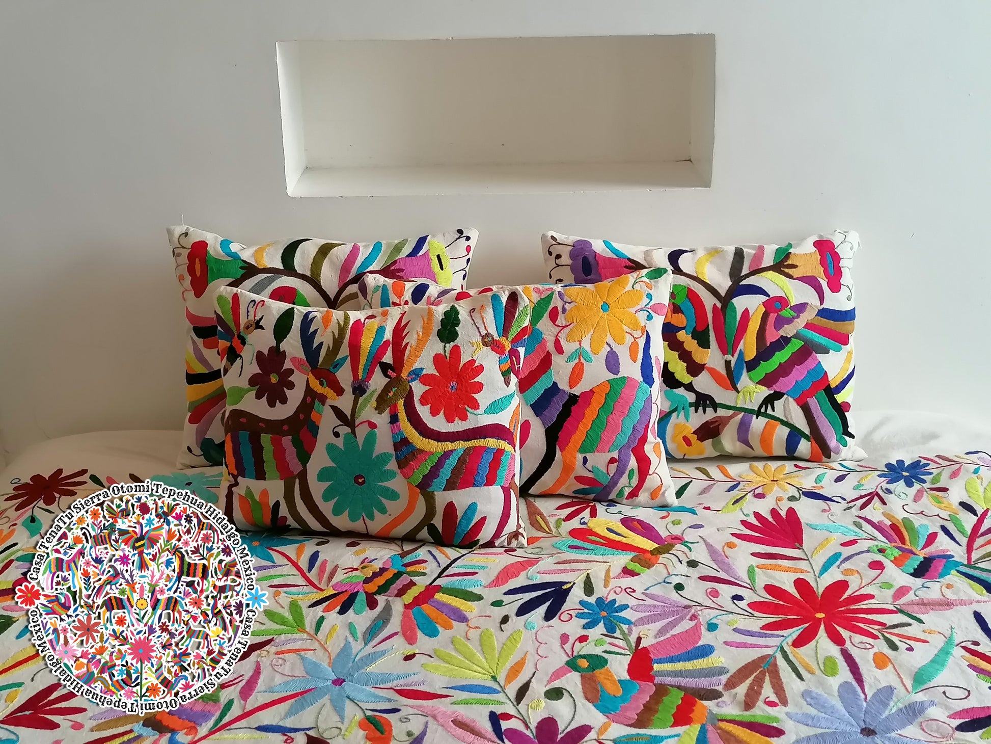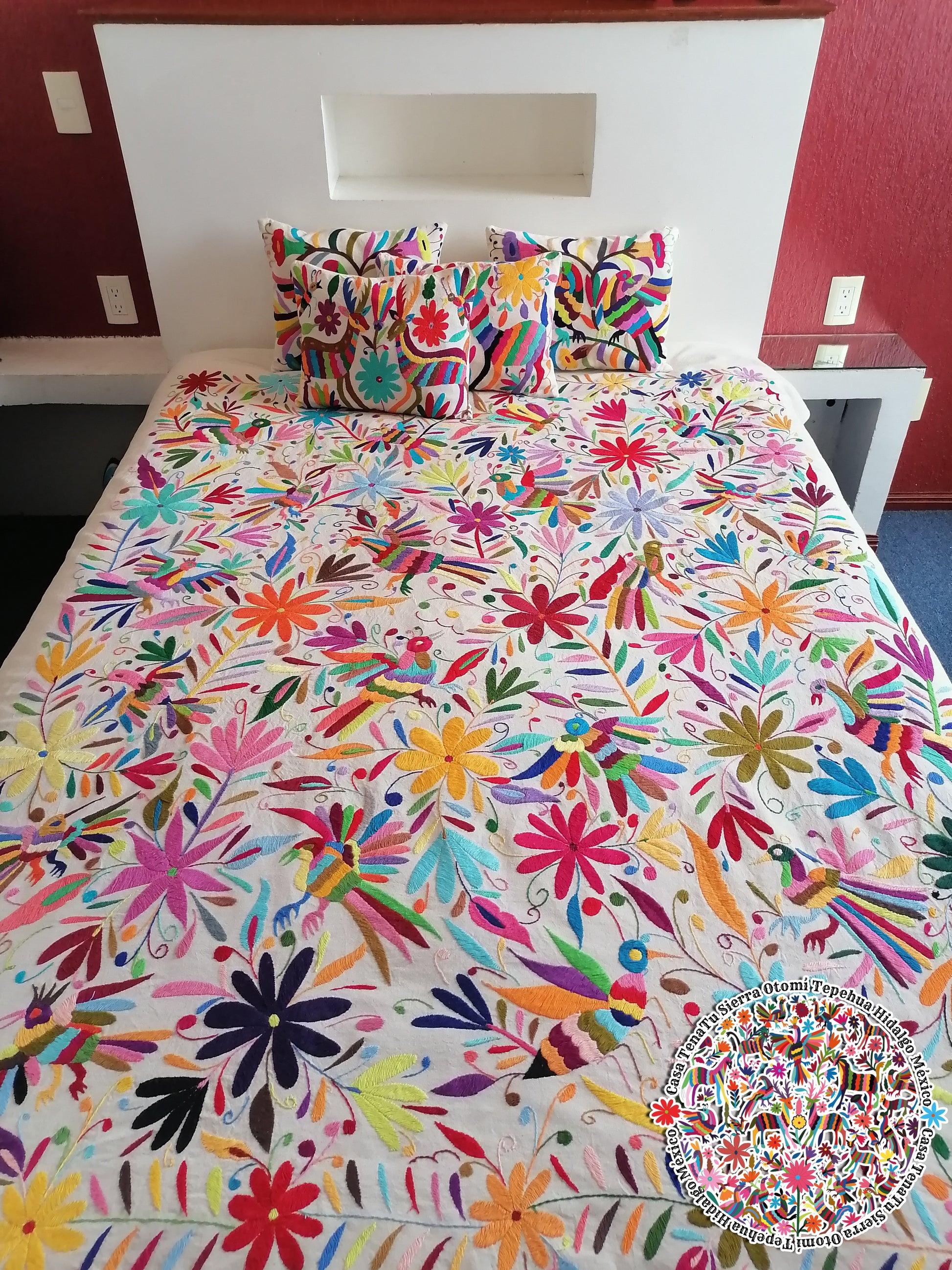Cubrecama Otomí multicolor flor y fauna San Bartolo