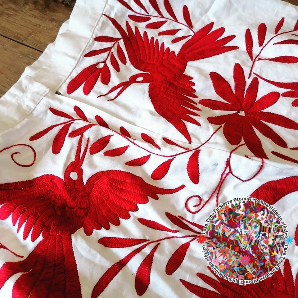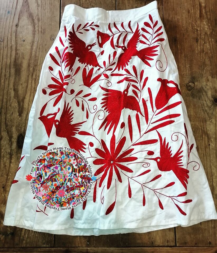 Hermosa falda en tela blanca, bordada con hilos color rojo quemado.