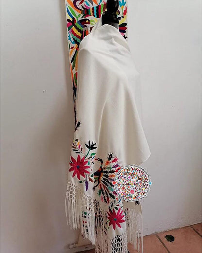 Hermoso rebozo Otomí de pavorreal, bordado a mano, multicolor.